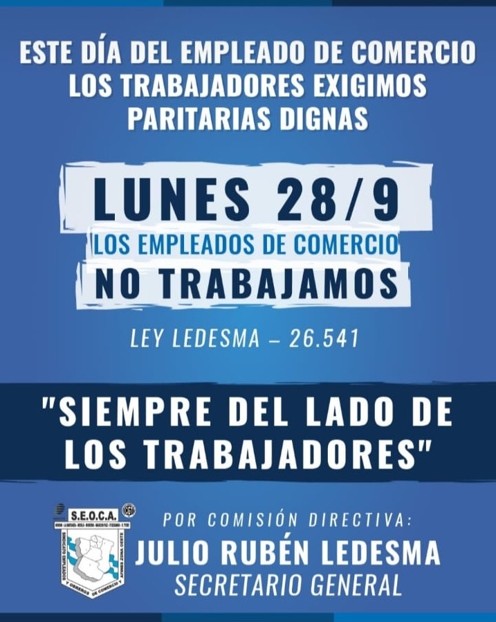 Para finalizar Ledesma pidió a los trabajadores mercantiles que este 28 de septiembre no vayan a trabajar «este lunes es un día para que los trabajadores festejen con su familia y se queden en sus casas». finalizó el Secretario General de SEOCA Zona Oeste.