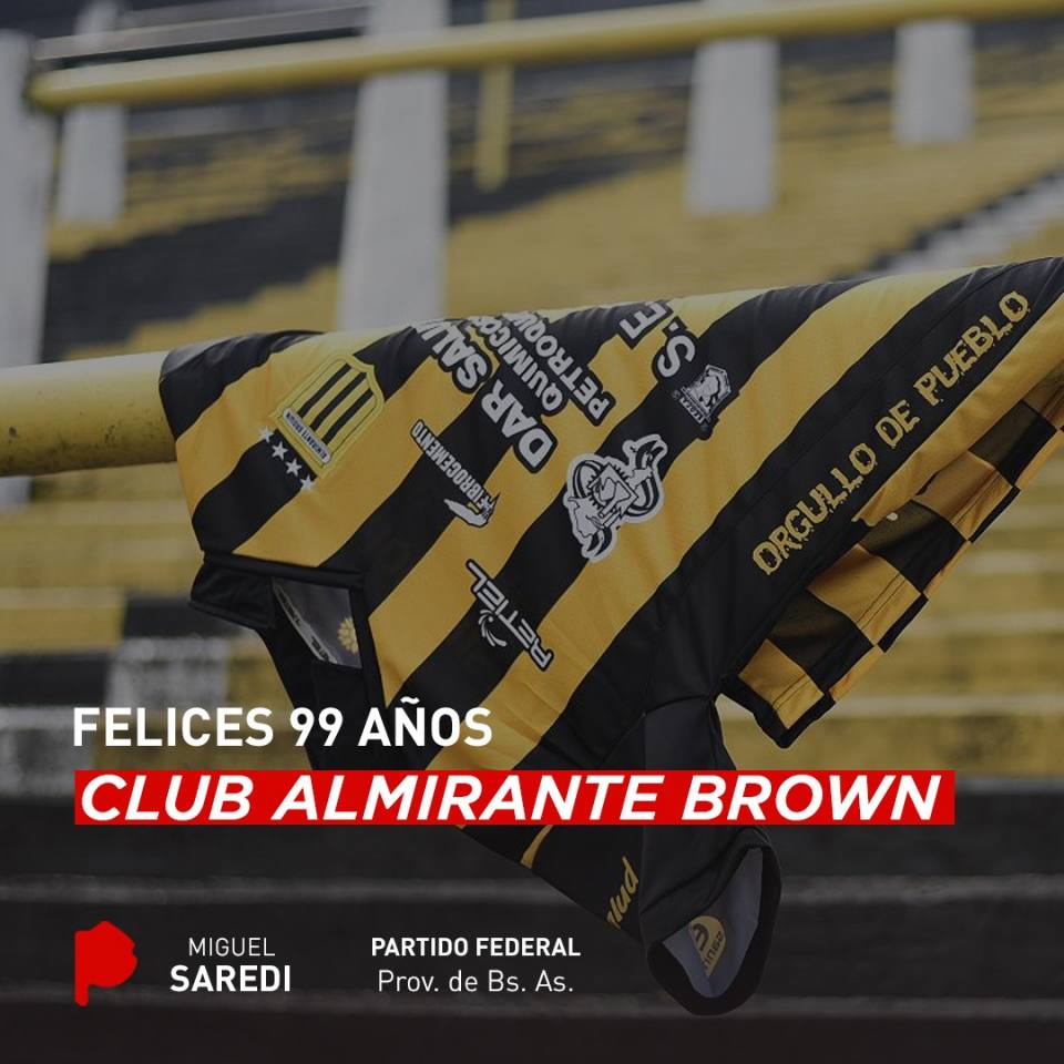 El Concejal de La Matanza por el Partido Federal, Dr. Miguel Saredi destacó y saludó al club Almirante Brown tras celebrarse su aniversario 99°: «Feliz aniversario a todos los hinchas fervientes, que no reconocen limite de distritos, y que todas las semanas juntaban peso por peso, para pagarse su entrada y ver un partido de su club, comprase su camiseta y ser fiel al mismo».