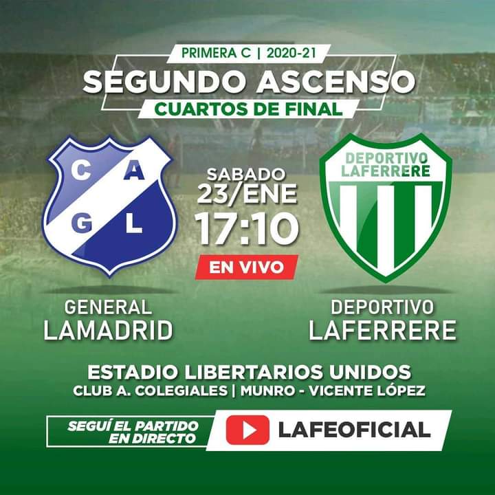 Se juegan los Cuartos de Final por el segundo ascenso y el Deportivo Laferrere, del partido de La Matanza se enfrenta a General Lamadrid el próximo sábado 23 de Enero a las 17.10hs en el estadio «Libertarios Unidos» del Club Colegiales en #Munro, Vicente Lopez.