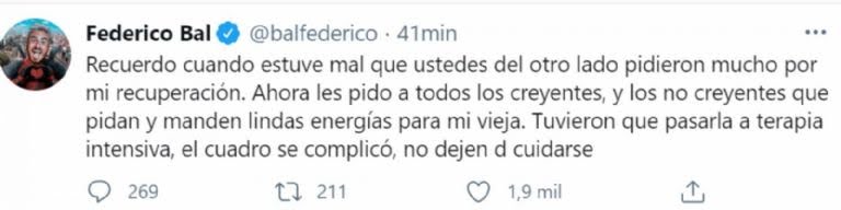 Enterado de la noticia, su hijo Federico Bal se expresó a través de Twitter: «Recuerdo cuando estuve mal que ustedes del otro lado pidieron mucho por mi recuperación. Ahora les pido a todos los creyentes, y los no creyentes que pidan y manden lindas energías para mi vieja. Tuvieron que pasarla a terapia intensiva, el cuadro se complicó, no dejen de cuidarse».