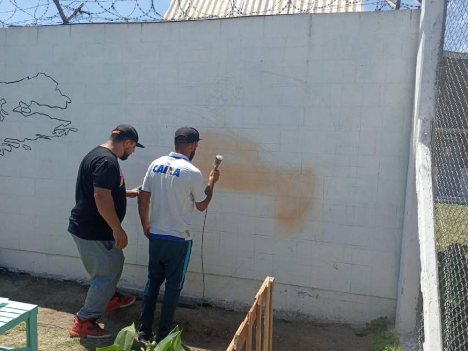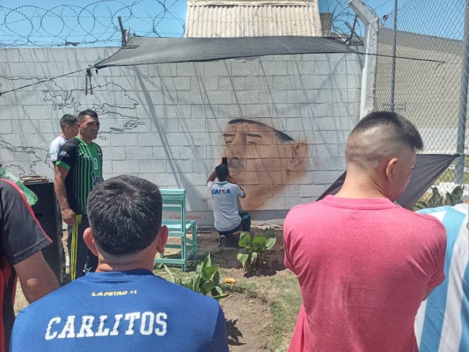 El homenaje al mejor jugador de todos los tiempos se hizo frente a la mirada de 25 internos que siguieron paso a paso la creación de la obra de arte.