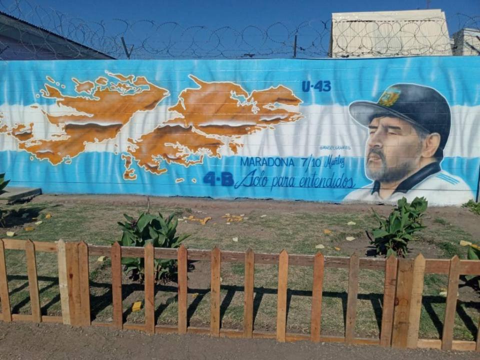 La gran imagen del gran astro del fútbol mundial està acompañada por el contorno geográfico de las islas Malvinas y un mensaje “Solo para entendidos”. Los graffiteros que llegaron a la unidad fueron contactados por el interno Germán Clavelino, quien es amigo del artista Víctor Sanchez desde temprana edad.