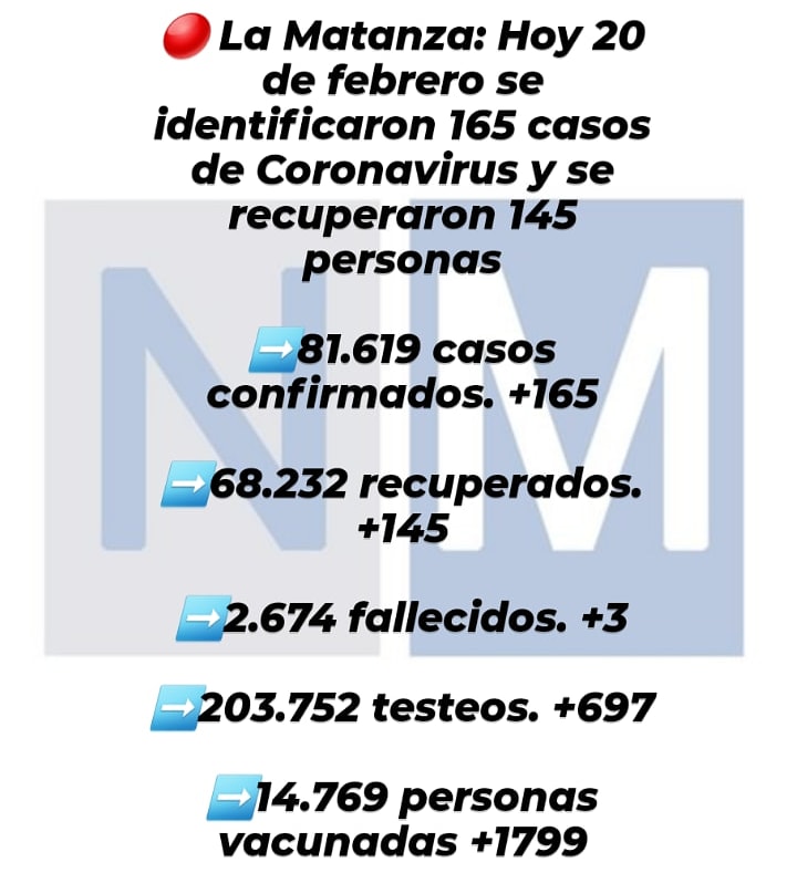 Estas fiestas se dan en un contexto de pandemia, donde el virus COVID-19 sigue atacando en territorio matancero. A continuación compartimos los datos de la enfermedad en el distrito del día 20 de febrero: