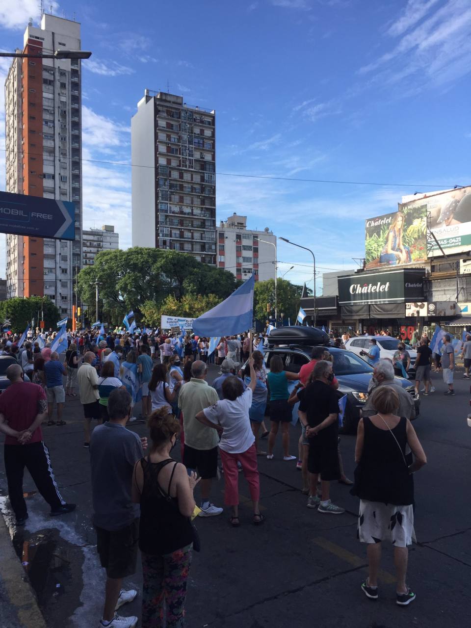 Los manifestantes comenzaron a llegar con banderas argentinas y globos celestes y blancos. La presencia de las fuerzas de seguridad fue escaza. Los manifestantes gritaban a coro, «¡que renuncien!», acompañados del golpe de sus cacerolas. Y también: «devuélvanme mi vacuna», «no tengo miedo al Covid-19, le temo a los parásitos de este gobierno populista», entre otros.