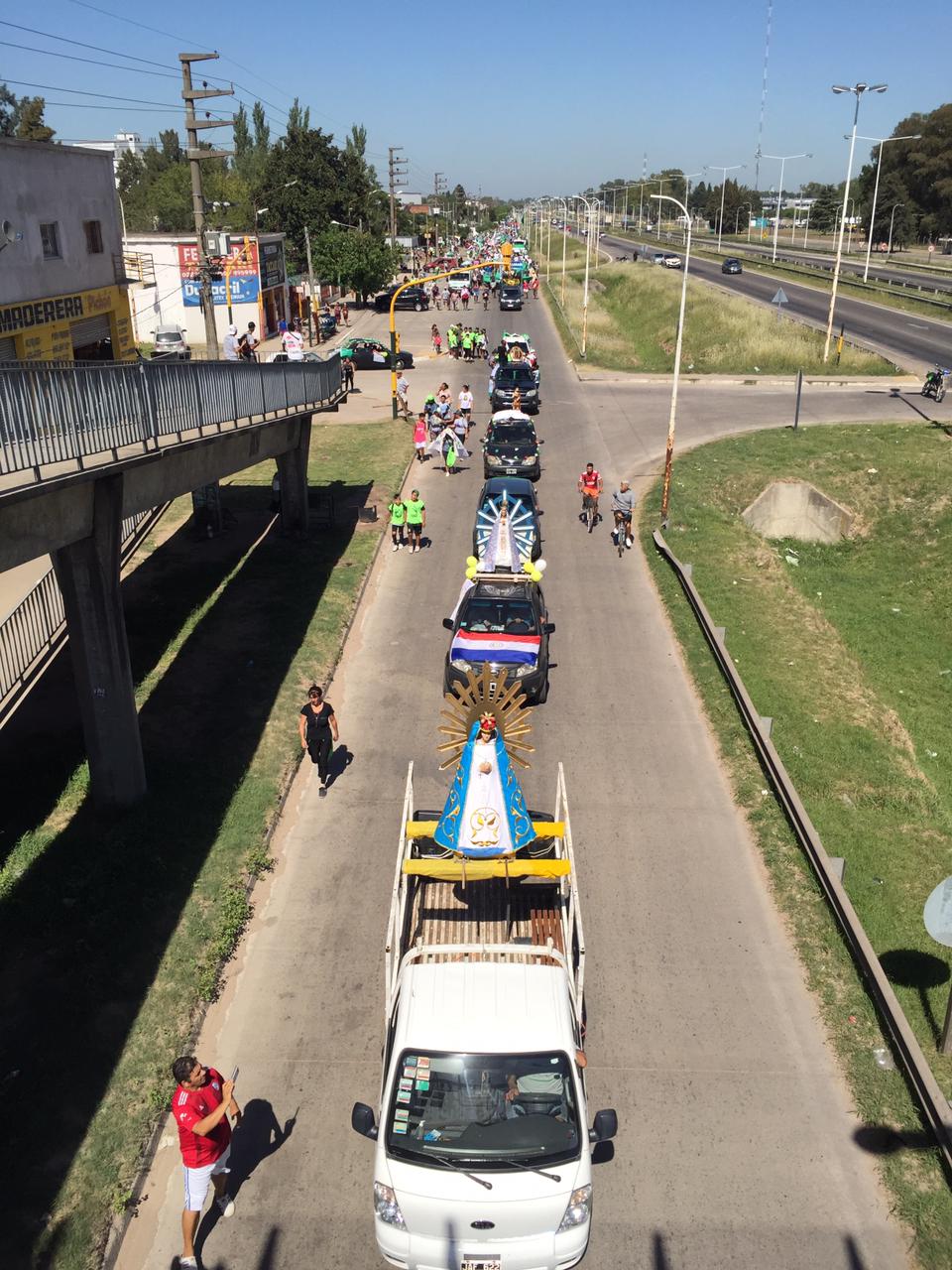 Vehículos que transportaban figuras de la Virgen María y de San José, fueron guiados por los bomberos voluntarios, personal policial en patrulleros y motos que eran escoltados por cientos de fieles que marcharon a pie bajo el rayo de sol.