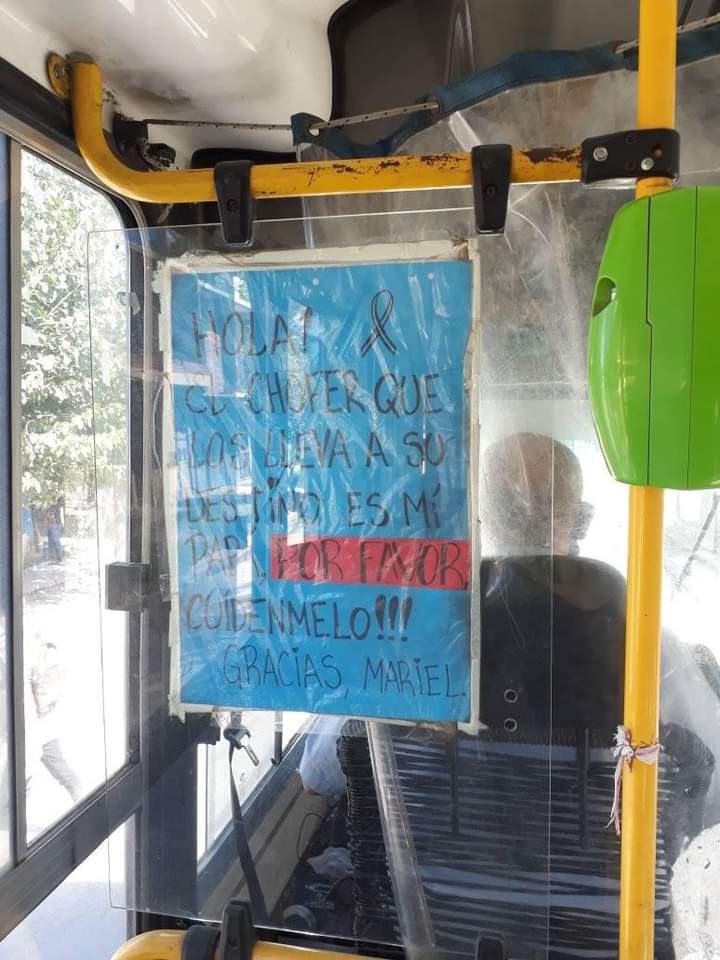 El afiche dice: «Hola, el chófer que los lleva a su destino es mi papá, por favor cuidenmelo!!! Gracias, Mariel».
