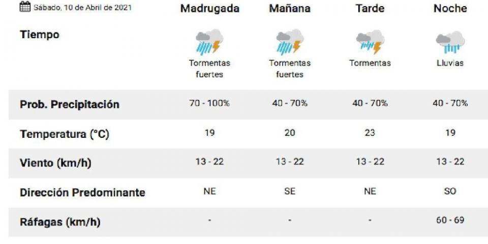Con viento proveniente del sector noreste y de hasta 22 km/h, se esperan precipitaciones fuertes para toda la jornada. Por la tarde, las lluvias llegarán con menos intensidad que durante el resto de la jornada.