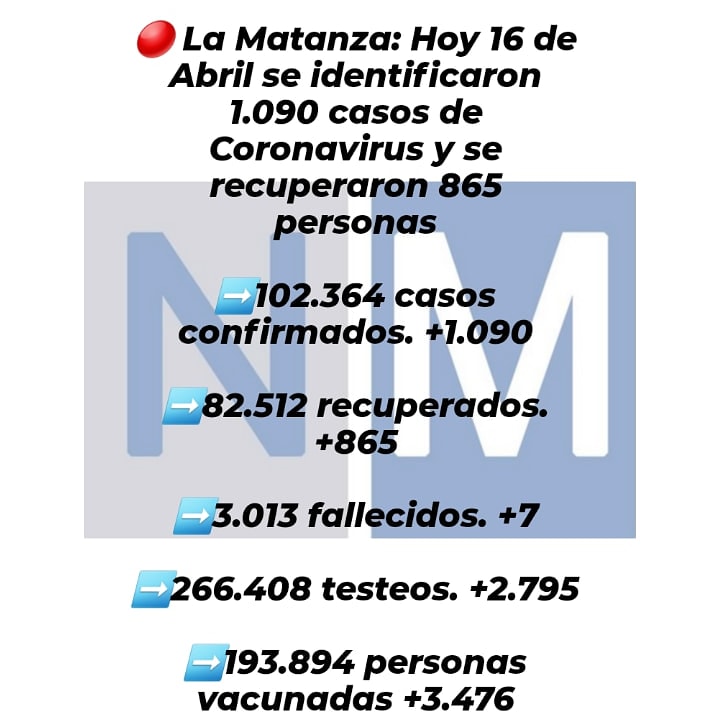 A CONTINUACIÓN COMPARTIMOS LOS DATOS DE CORONAVIRUS DEL DÍA 16 DE ABRIL EN LA MATANZA: