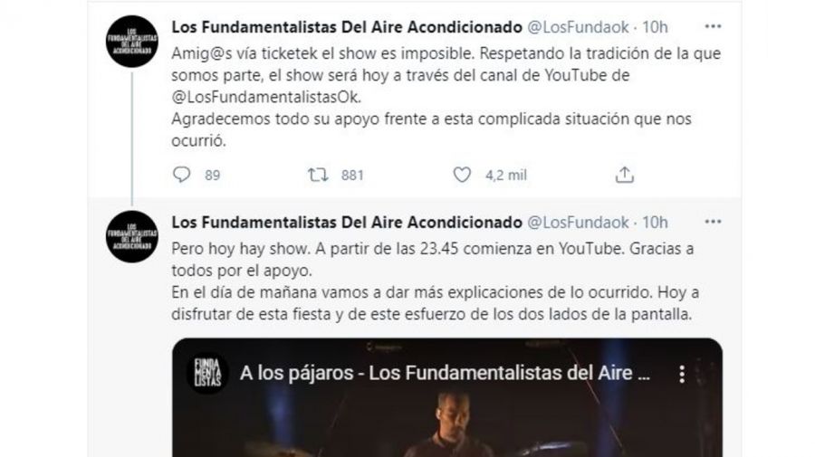 El colapso técnico en la plataforma de Ticketek, por donde se iba a transmitir el concierto anunciado para las 21 horas, hizo que la banda y el Indio Solari decidieran liberar el colosal show, montado en la abandonada localidad bonaerense de Villa Epecuén para todo el mundo, de forma gratuita desde las 23:45. «Amig@s vía ticketek el show es imposible. Respetando la tradición de la que somos parte, el show será hoy a través del canal de YouTube de @LosFundamentalistasOk. Agradecemos todo su apoyo frente a esta complicada situación que nos ocurrió (…) A disfrutar de esta fiesta y de este esfuerzo de los dos lados de la pantalla», indicó el guitarrista de la banda, Gaspar Benegas, en Twitter. Virginia Mones Ruiz, esposa del Indio, repicó la noticia en sus redes también.