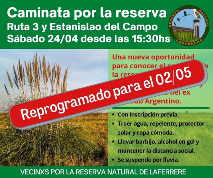 El evento se iba a realizar el pasado sábado, pero ante la lluvia, los Vecinos por la Reserva Natural de Laferrere, reprogramaron la caminata para el 2 de mayo a las 15:30hs.