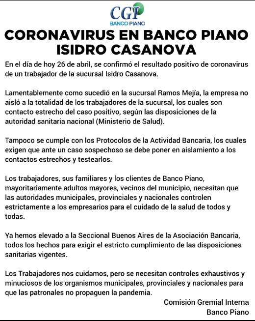 Desde la Comisión Gremial Interna del Banco Piano informaron que en el día de hoy 26 de abril se confirmó el resultado positivo de Coronavirus de un trabajador de la sucursal, pero como había sucedido en la sucursal de Ramos Mejía, la empresa no aisló a la totalidad de los trabajadores de la sucursal, los cuales son contacto estrecho, en tanto según las disposiciones sanitarias deberían guardar aislamiento de 10 días.