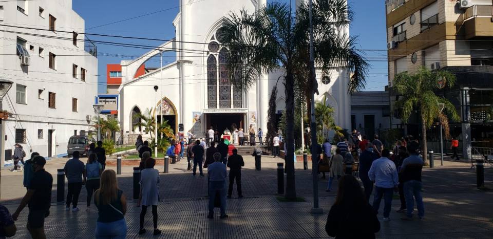 Con la nuevas reglas que impone la segunda ola de Covid 19, la misa tuvo lugar en las escalinatas de la Iglesia Catedral de San Justo, y en la propia Plaza San Martín .