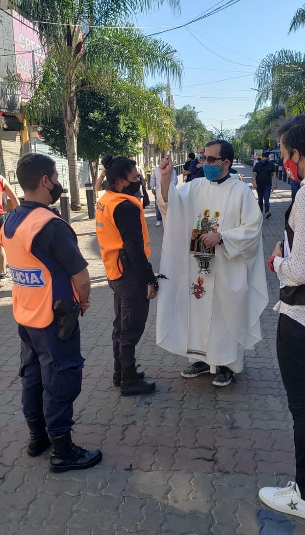 Acto seguido un grupo reducido de comerciantes y dirigentes gremiales acompañaron al sacerdote en la bendición de locales comerciales donde los trabajadores desarrollan su vida laboral.