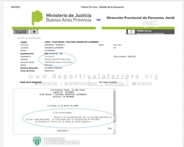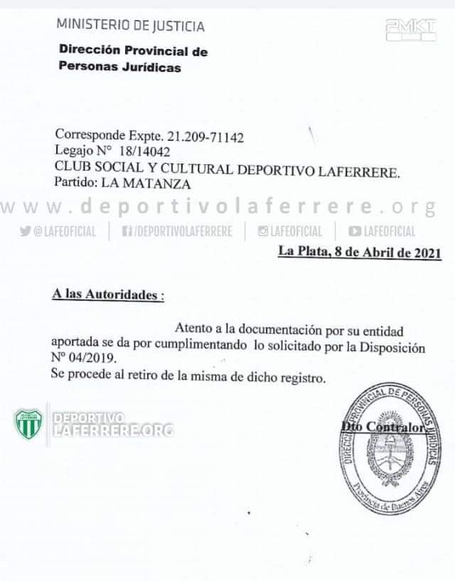 El mensaje económico concluyó, con que gracias a esta la labor, se realizaron las presentaciones correspondientes en la Dirección de Provincial de Personas Jurídicas y se levantó la personería, por lo cual, el Club Social y Cultural Deportivo Laferrere se encuentra nuevamente activo.