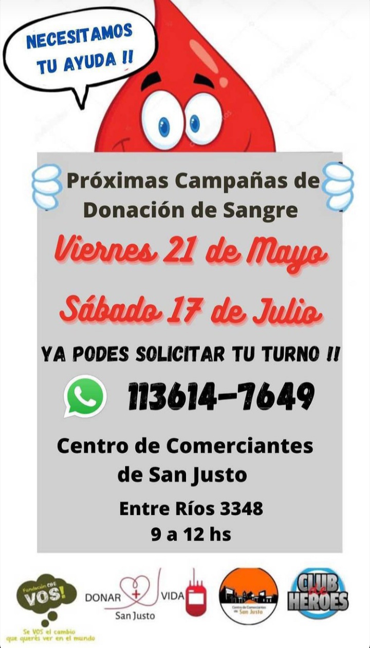 Organiza la Fundación Che Vos, Donar más Vida, Centro de Comerciantes de San Justo y Club de Héroes.