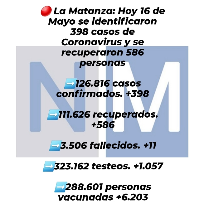 A CONTINUACIÓN COMPARTIMOS LOS DATOS DE CORONAVIRUS DEL DÍA 16 DE MAYO DE LA MATANZA: