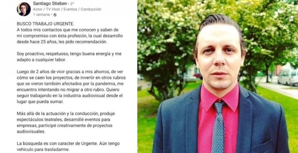 “Busco trabajo urgente. A todos mis contactos que me conocen y saben de mi compromiso con esta profesión, la cual desarrollo desde hace 25 años, les pido recomendación”, comenzó diciendo en un posteo en el que se describió como “proactivo”, “respetuoso”, y con “buena energía”, comenzó escribiendo Santiago en su posteo.