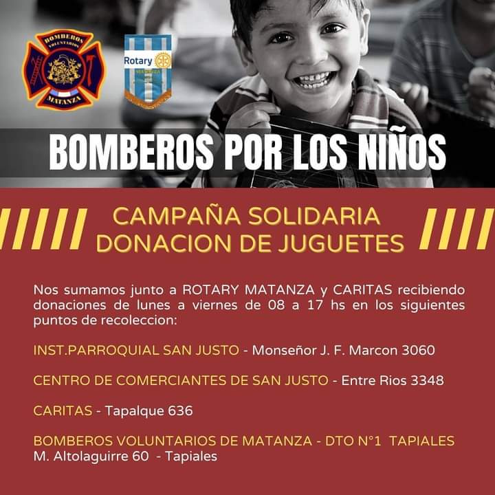 Se acerca el día del niño y los Bomberos Voluntarios de La Matanza junto al Rotary Club y Caritas organizan una colecta solidaria de juguetes.