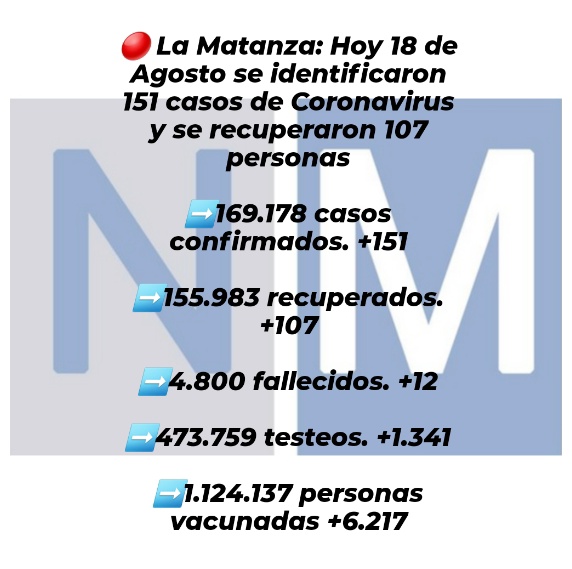 El distrito de La Matanza reportó 151 nuevos contagios el 18 de agosto y desde que empezó la pandemia en La Matanza hubo 169.178 de casos positivos. Además, se registraron 12 fallecidos y el total de muertos es 4.800. En tanto, los recuperados suman 155.983
