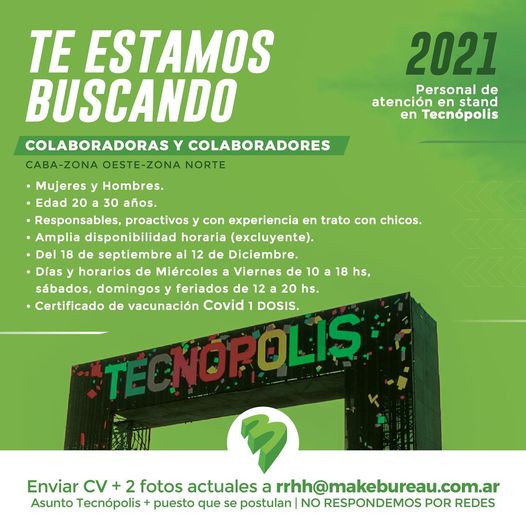 Los interesados en trabajar en la próxima muestra deberán enviar su currículum con dos fotos actuales al mail rrhh@makebureau.com.ar y en el asunto colocar “ Tecnópolis + puesto al que se postulan”. Este es el único medio válido para postularse al trabajo, la entidad no recogerá postulaciones desde sus redes sociales fuera del mail oficial.