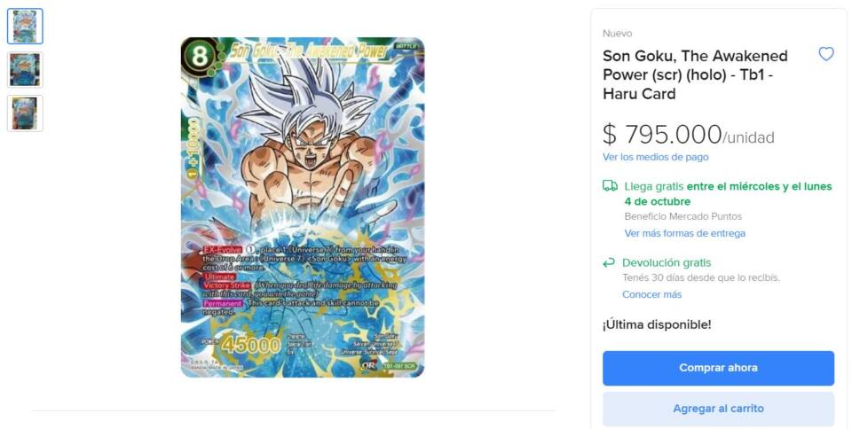 Un vecino de Laferrere, La Matanza, escribió en un reconocido portal sobre le precio que tiene en el principal portal de compra venta de Argentina, una edición especial de las figuritas de Dragon Ball, «Son Goku, The Awakened Power (scr) (holo) – Tb1 – Haru Card»