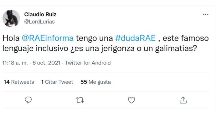 La pregunta que se le realizó a la entidad de la lengua fue hecha bajo el hashtag #RAEconsultas por el tuitero Claudio Ruiz, que utilizó algo de ironía al enunciar su interrogante. “Hola, RAE informa, tengo una duda: este famoso lenguaje inclusivo, ¿Es una jerigonza o un galimatías?”, fue la consulta, que se subió a la red social el pasado 6 de octubre.