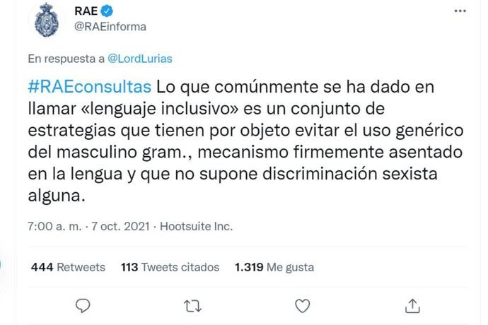 La respuesta de la RAE no tardó en llegar. Al día siguiente, la entidad que, según se define a sí misma está “dedicada a preservar el buen uso y la unidad de una lengua en permanente evolución y expansión”, respondió a la consulta en la misma red social.