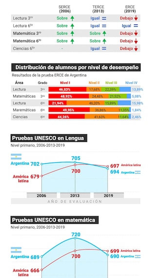 Los datos alarman, especialmente si se toma la serie completa del Estudio Regional Comparativo y Explicativo (ERCE). En 2006, la primera edición de la prueba, Argentina quedó por encima del promedio en las cuatro áreas que se midieron por entonces. Seis años después, en 2013, ya se observaba una caída en el rendimiento comparado a la región. Ahora, en el estudio revelado hoy, los chicos argentinos muestran peores resultados que sus pares en matemática, lengua y ciencias naturales.
