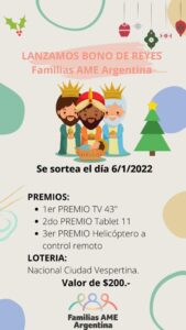 La Fundación de Familias AME Argentina lanzó un bono solidario de Reyes para recaudar fondos que se sorteará el 6 de enero por la Lotería Nacional Ciudad Vespertina.