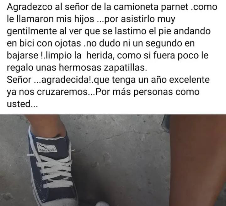 La mujer contó que su hijo se lastimó el pie cuando paseaba en bicicleta en ojotas. En ese momento un hombre que presenció lo que sucedía, bajó de su camioneta, ayudó al niño, lo curó, limpió su herida, y como si fuera poco le regaló un par de zapatillas nuevas.