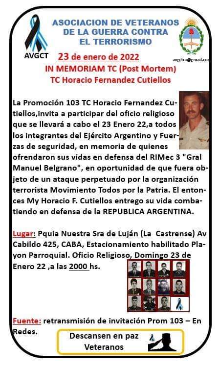 La AVGCT y la promoción 103 TC Horacio Fernández Cutiellos organizó ésta noche una ceremonia religiosa en memoria de quienes dieron su vida defendiendo a la Patria aquel 23 de enero en la toma terrorista al Regimiento de La Tablada.