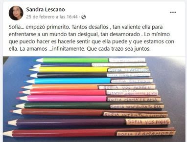 “Como abuela me surgió una idea para acompañarla en el aula. Pensé en los colores, en escribirle frases que saliesen de mi corazón. Para ella es todo un desafío todo. Por eso me pareció que ese detalle le hará entender a los demás la importancia del respeto y la empatía con los demás”, reflexiona Sandra, y agrega: “Mi nieta es la dulzura personificada, ¡jamas se enoja, siempre sonriente, muy valiente!”.