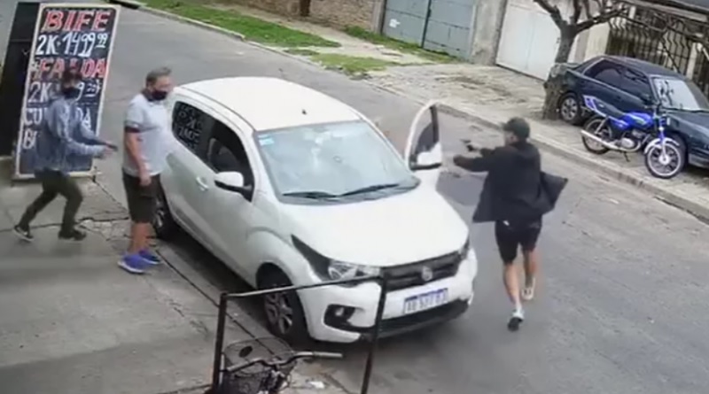 A través de las cámaras de seguridad se deja ver el momento exacto en el que los delincuentes atacan al hombre y a la mujer que subían al auto, y se terminan llevando el vehículo.