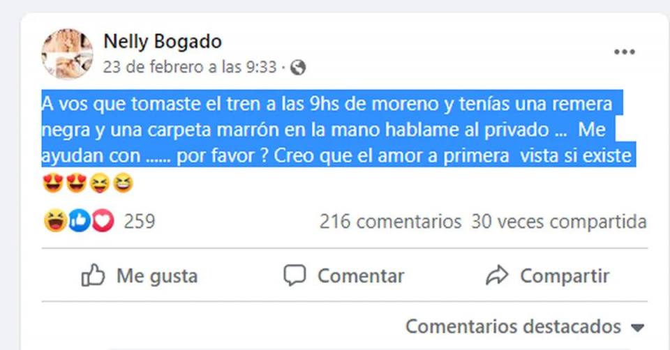 La mujer afirma haber encontrado a su príncipe azul en el tren, y no descansará hasta encontrarlo. Así las cosas, comenzó la busqueda de este hombre. La publicación de la búsqueda dice: «A vos que tomaste el tren a las 9hs de Moreno y tenías una remera negra y una carpeta marrón en la mano háblame al privado«.