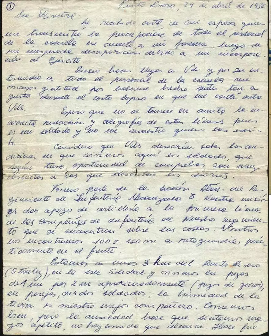 No hemos tenido tiempo para despedirnos y eso me ha tenido preocupado muchas noches aquí en Malvinas, donde me encuentro cumpliendo mi labor de soldado: Defender la Bandera.