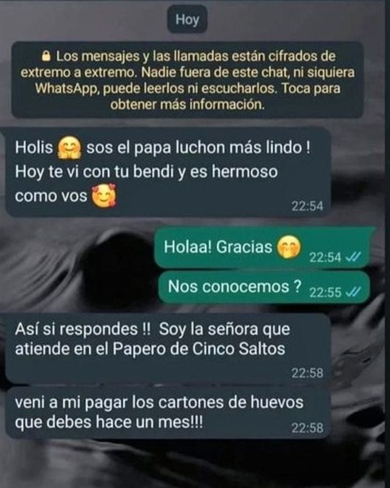“Holis. ¡Sos el papá luchón más lindo! Hoy te vi con tu bendi y es hermoso como vos”, decía un mensaje de WhatsApp dirigido al hombre en cuestión, que hizo una compra, no la pagó tampoco regresó con el dinero.