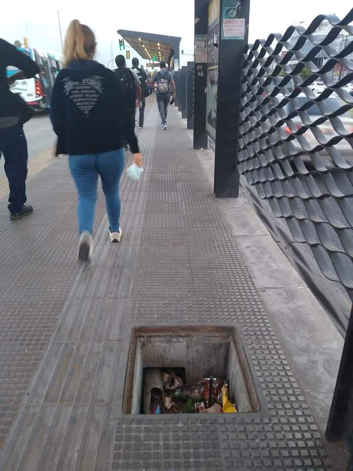Allí vecinos alertan que hay pozos de aproximadamente 30cm de profundidad, donde se acumula basura y existe un peligro latente para los pasajeros. Hay por lo menos 6 pozos por dársena a lo largo de todo el Metrobus.