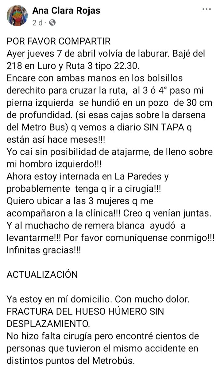 Una vecina fue víctima de estos pozos sin tapa, donde se fracturó el húmero y le quedó la rodilla machacada. La mujer con vecinos crearon un grupo de Facebook para reclamar una pronta solución:(https://www.facebook.com/groups/1371526270010806/?ref=share )