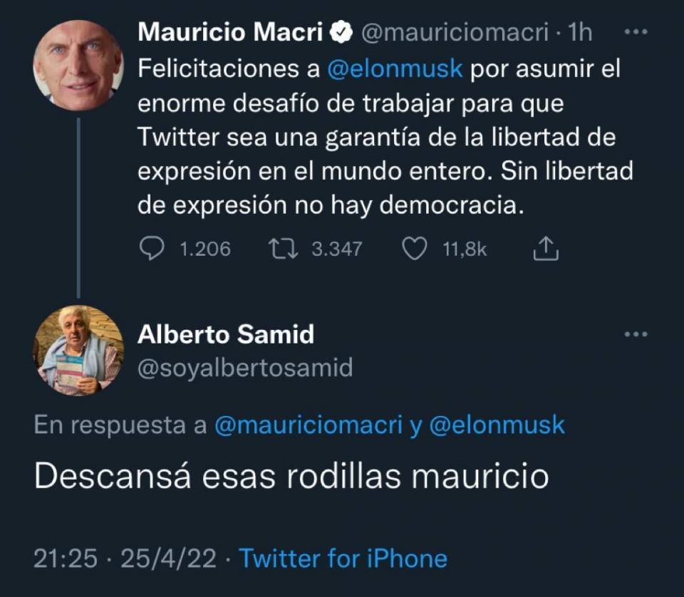 Alberto Samid respondió a un tweet de Macri y fue lapidario: «Descansa esas rodillas Mauricio», ante los saludos del ex mandatario al Ceo Musk tras comprar la red social Twitter.