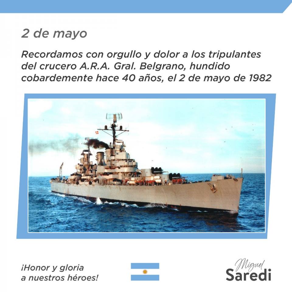 «Hoy recordamos con orgullo y con dolor a los tripulantes del Crucero A.R.A. Gral. Belgrano, hundido cobardemente el 2 de mayo 1982 por un submarino pirata inglés. El Crucero contaba 1093 tripulantes y perecieron 323 de ellos. Memoria», expresó Miguel Saredi.