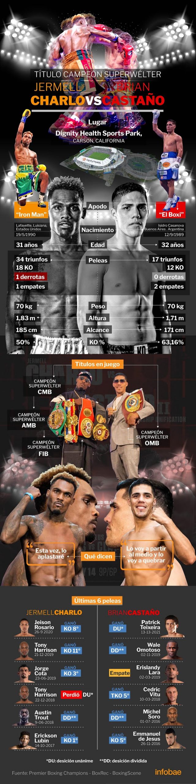 El oriundo de Isidro Casanova, partido de La Matanza, tiene el desafío más importante de su trayectoria a los 32 años. Con 17 triunfos (12 KO) y 2 empates en su etapa como profesional, Castaño intentará sacarle el último asterisco a su carrera después de no haber podido triunfar en dos de los combates más importantes que afrontó hasta el momento. Tras aquella igualdad contra el cubano Erislandy Lara en el mítico Barclays Center de Brooklyn durante 2019, tampoco pudo conformar a los jueces el año pasado en el primer duelo ante Charlo.