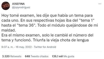 “Me sorprendió la repercusión del tweet, ya que creí que no lo iba a ver mucha gente. Lo escribí porque me causó risa la situación, creo que a los demás también, y de ahí la viralización. Lo gracioso es que muchos empezaron a contar sus experiencias en exámenes y nos dejaron a las profes de Lengua como brujas. Quizá un poco lo somos”, declaró Josefina, en conversación con el medio local Todo Noticias.