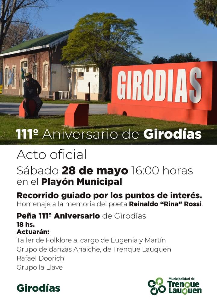 Saredi indicó que: «el pueblo de Girodias, fue fundado un 10 de junio del año 1909, pero la traza oficial de la localidad fue realizada un 28 de mayo del año 1910, por ese motivo; hoy se celebra su 111 aniversario».