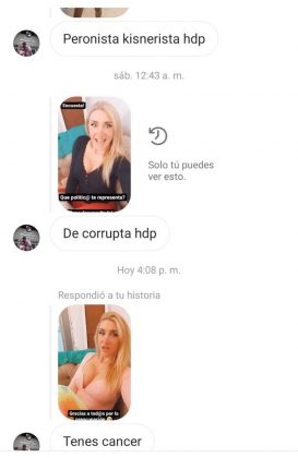 Asimismo aseguró «recibo cientos de estos mensajes todos los días de grupos organizados y pagados» y se interrogó «intentan callarme? Intentan desmoralizarme? Intentan que deje de bancar el proyecto nacional y popular? Saben lo que logran? Darme más impulso para gritar con más fuerza».