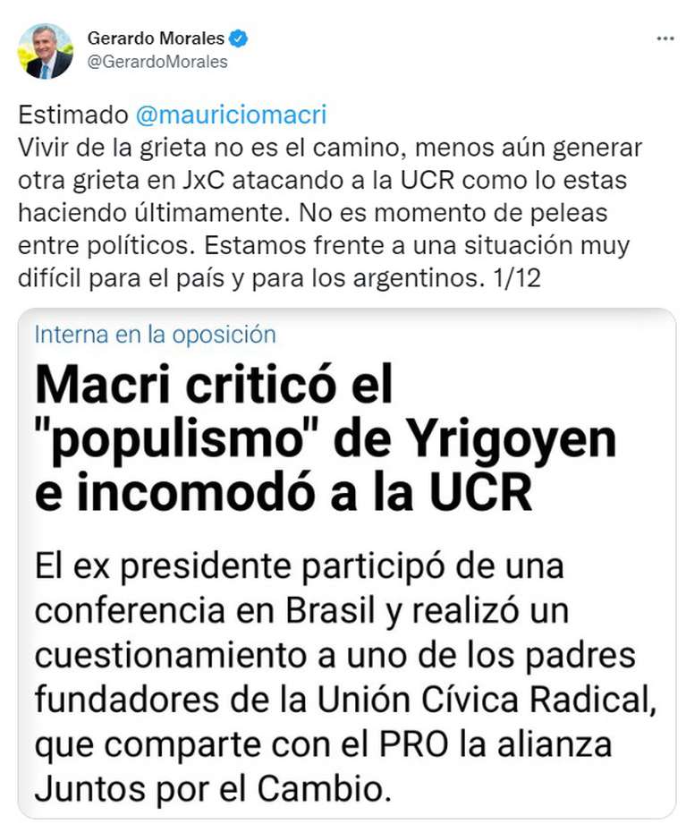 Morales planteó en un hilo de tuits, con fuertes críticas a Macri: “Vivir de la grieta no es el camino, menos aún generar otra grieta en Juntos por el Cambio atacando a la UCR, como lo estás haciendo últimamente”.