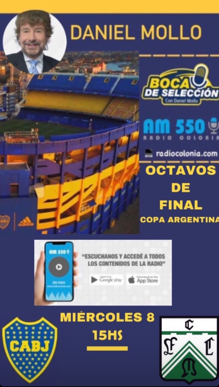 Seguilo hoy miércoles desde las 15hs por Boca de Seleccion con Daniel Mollo por am 550 radio Colonia
