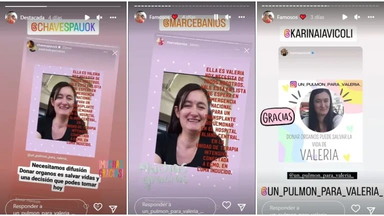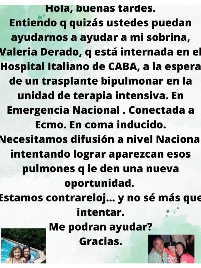 Según se desprende de la información que dio su entorno en el perfil que crearon en Instagram, Valeria ya está en lista de espera en emergencia nacional, conectada a Ecmo (una técnica extracorpórea para proporcionar soporte cardíaco y respiratorio) y en coma inducido. “Necesitamos difusión a nivel nacional para lograr que aparezcan esos pulmones que le den una nueva oportunidad. Estamos contrarreloj”, escribieron en un posteo.