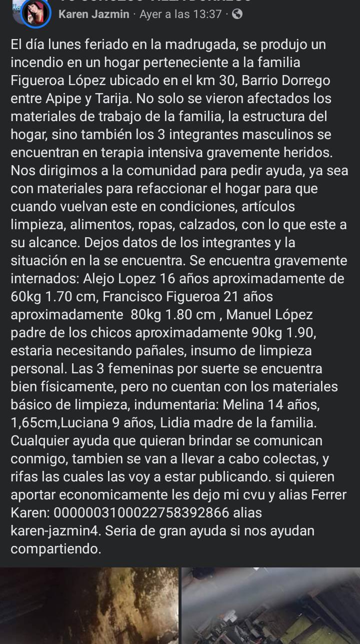 En ese sentido los vecinos piden ayuda a la comunidad y solicitan la donación de lo que esté a su alcance, ya sea algún material para poder reconstruir el hogar, artículos de limpieza, alimentos, ropa, calzados, etc.