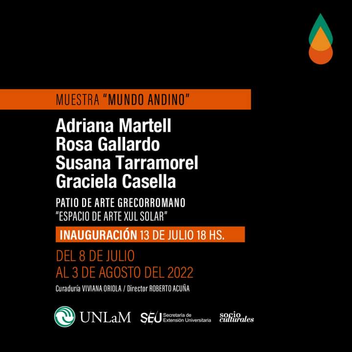 En esta oportunidad, la muestra se llama «Mundo Andino” y es del colectivo artistico conformado por Adriana Martell (Salta), Rosa Gallardo (Salta), Susana Tarramorel (Mar del Plata) y Graciela Casella (CABA). Presentan en este caso un homenaje a la Chakana mediante su muestra “Mundo Andino”.