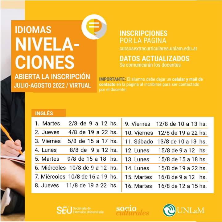 Para los menores de 17 años, se debe realizar una preinscripción. Cualquier duda o consulta, pueden comunicarse enviando un correo a idiomas@unlam.edu.ar o llamando al 4480-8900 int. 8723